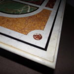 Tavolo intarsiato a cassina lavorato e lucidato a mano , eseguito nel 1989 su marmo Carrara spessore 2 cm, pietre di cava antica, broccatello di Spagna, verde Malachite, breccia Rossa , nero di Belgio.